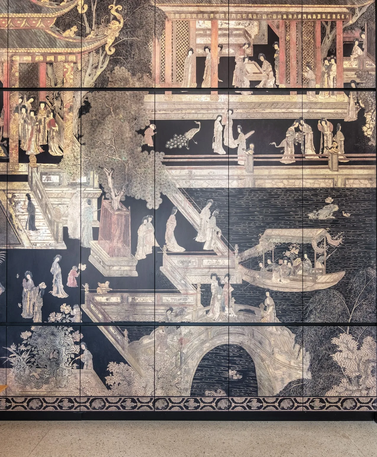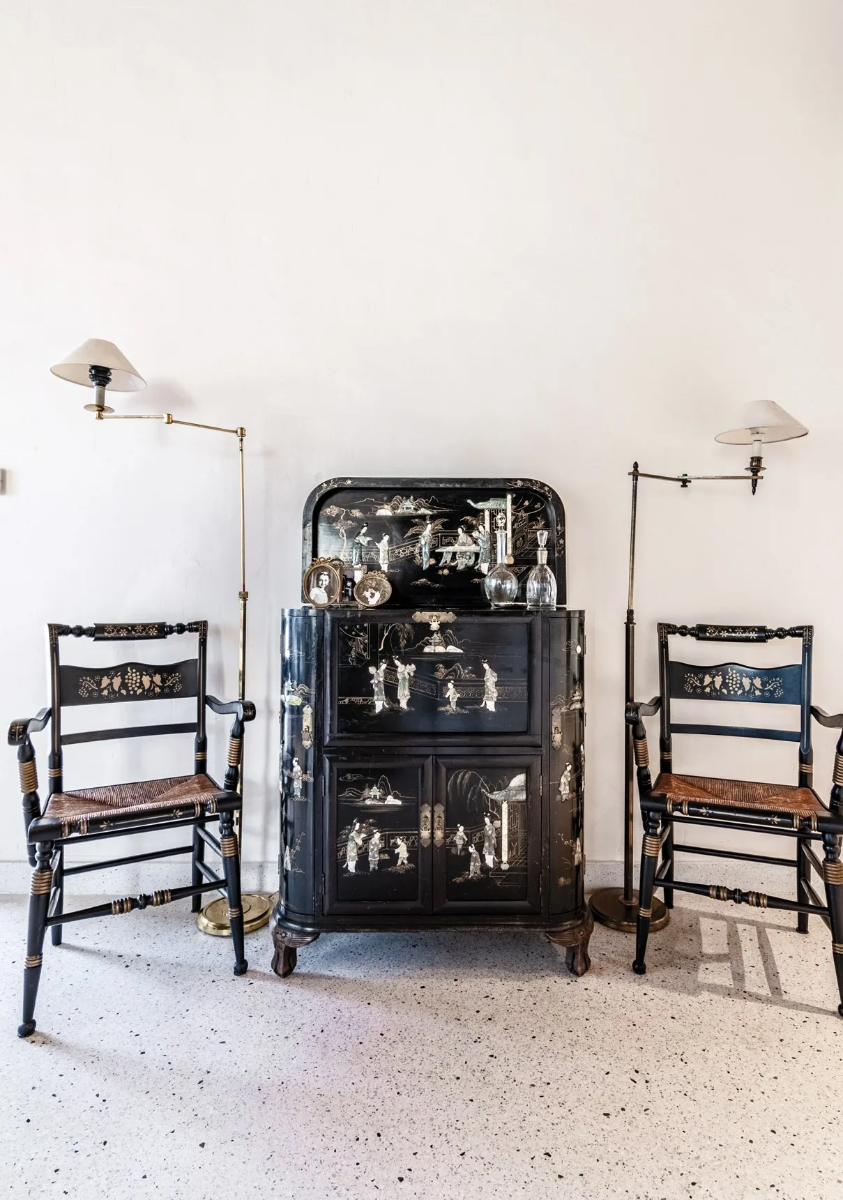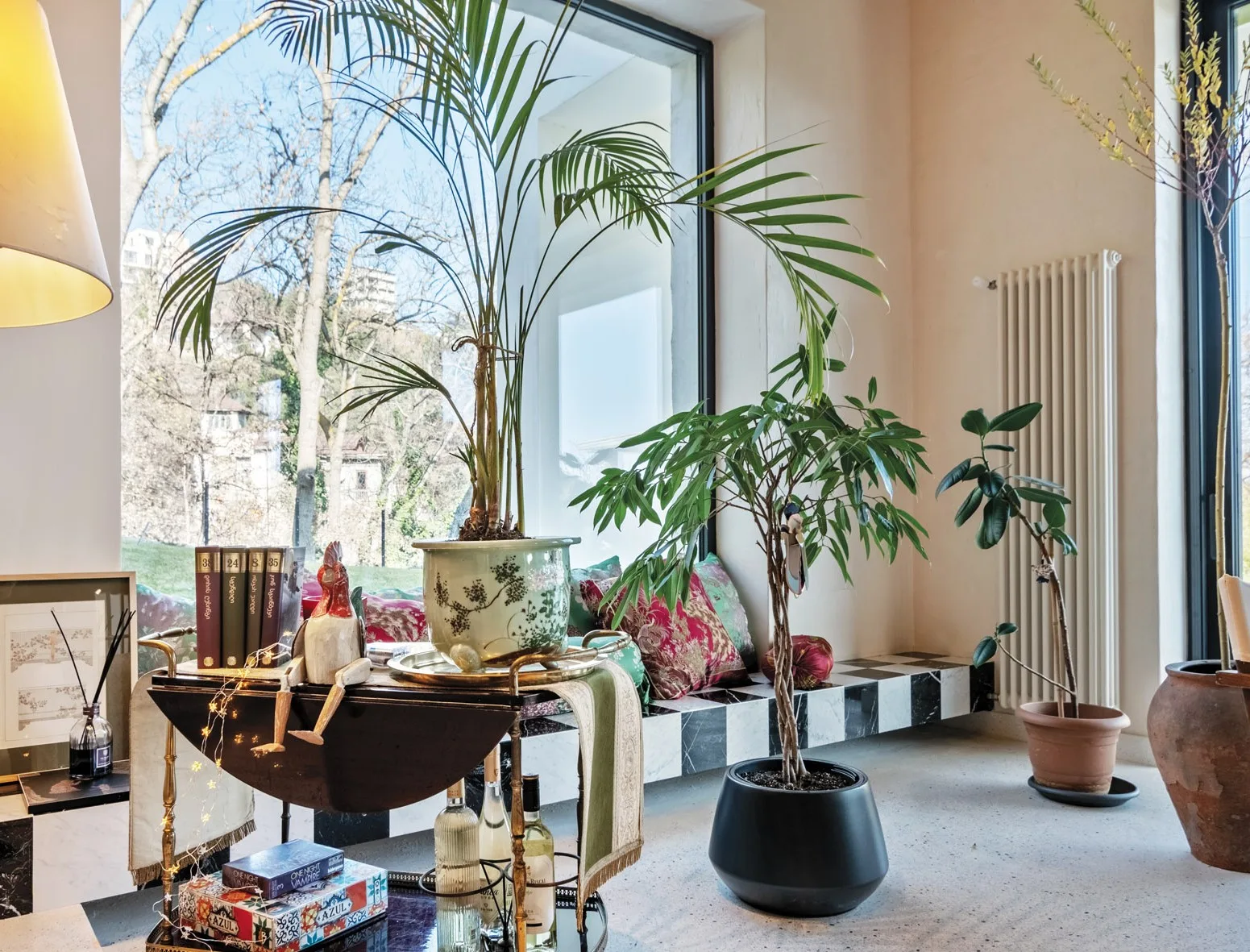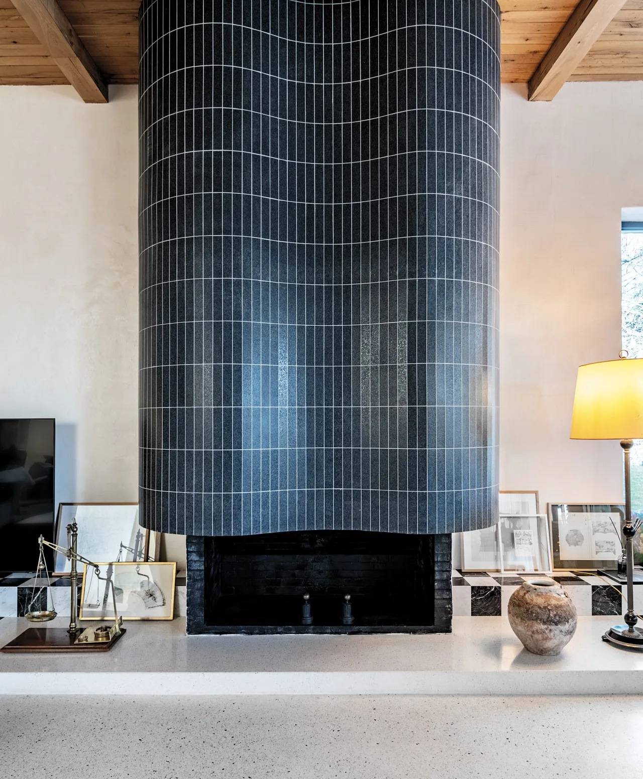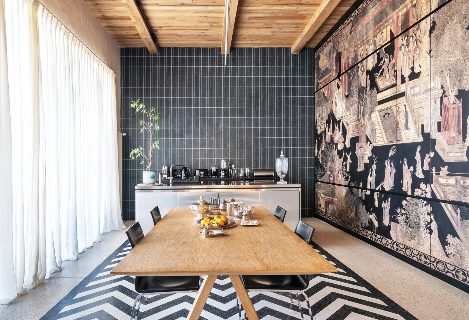 There are several key accents in the interior: in the living room, a fireplace clad in black cut stone and a long shelf composed of black and white tiles. In the kitchen, the accent is created by the printed cabinet that evokes associations with a Chinese folding screen, as well as the black-and-white mosaic floor pattern. The remaining elements are more or less neutral and help to emphasize these accents.