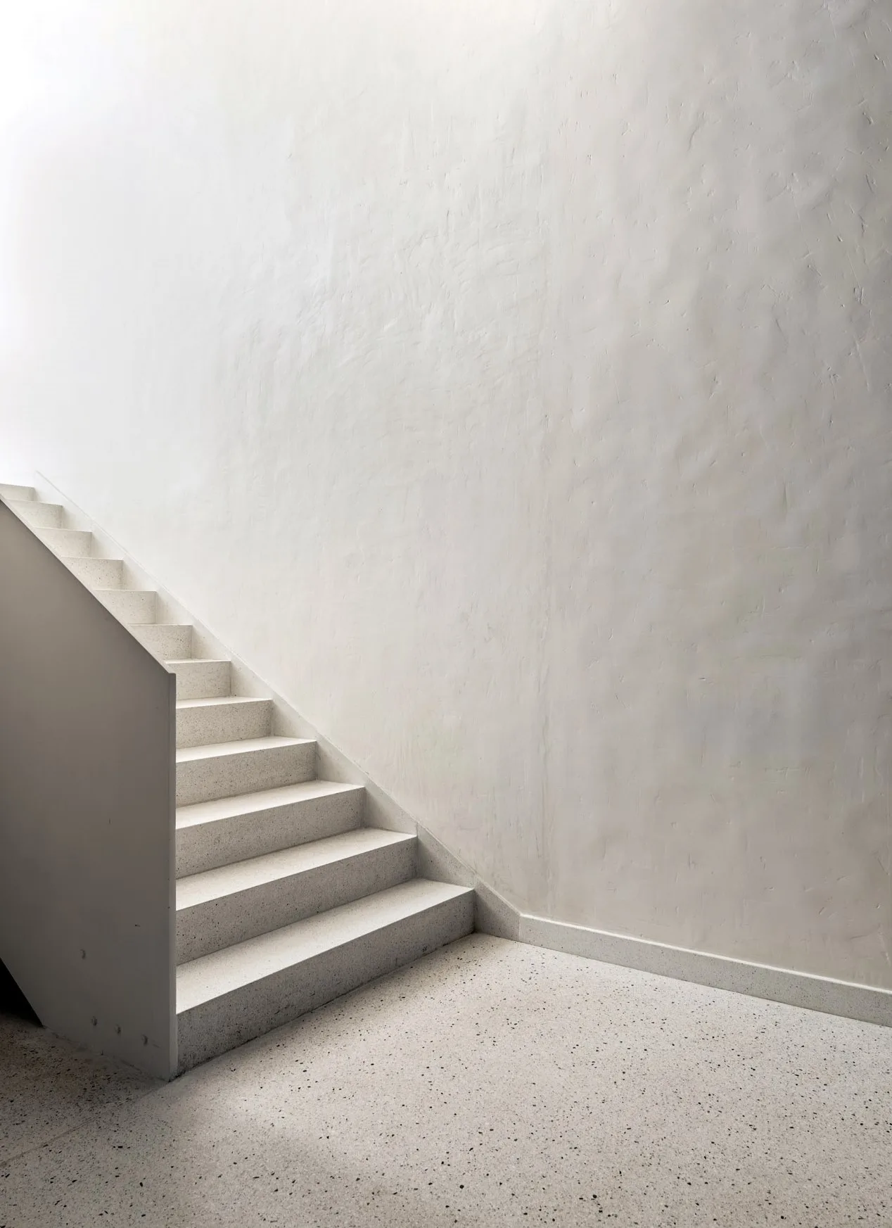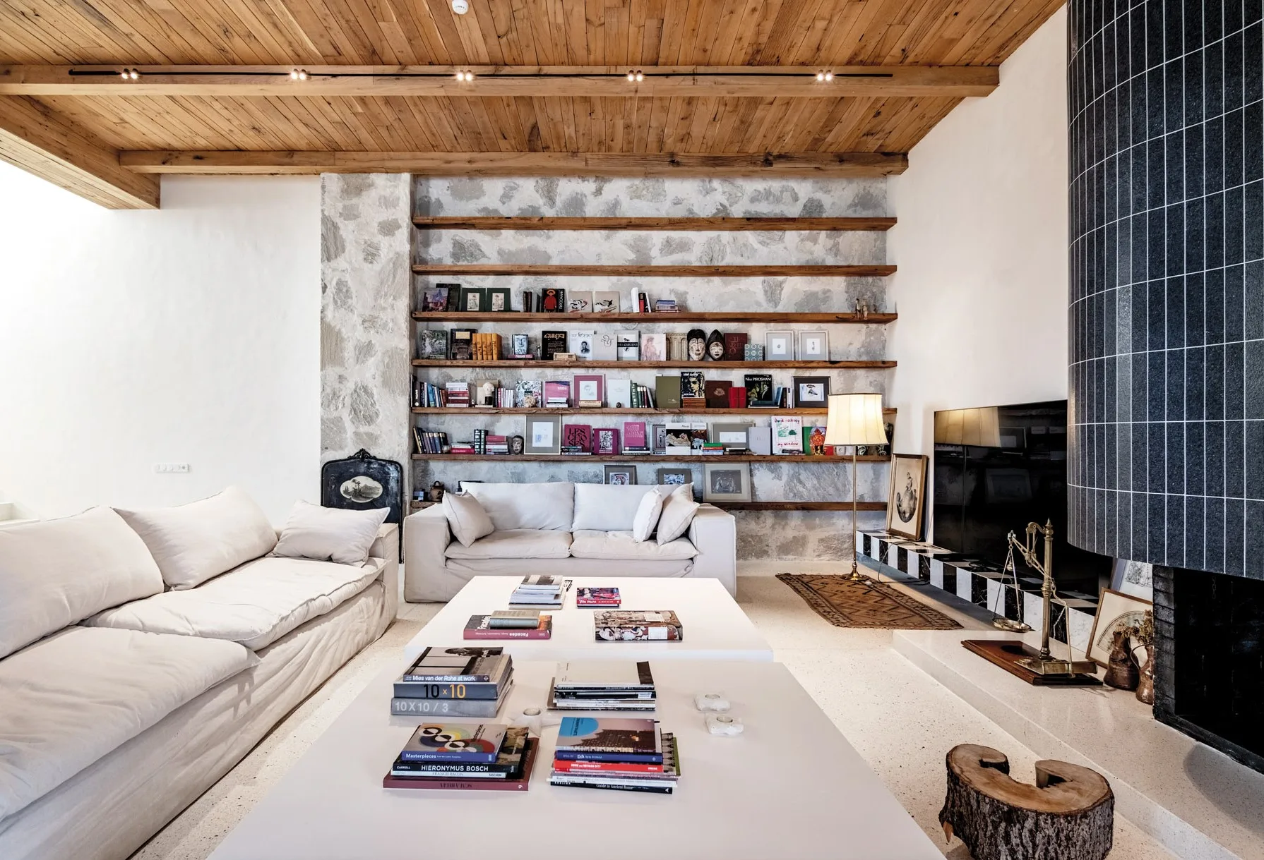 For the exterior finishing material, stone masonry and white plaster were used. The interior walls are mostly plastered white, with stone inserts; the ceiling is clad with wooden boards, and mosaic is used on the floor. Due to the relief, we enter the house at an intermediate level: by one flight of stairs we reach the living room and kitchen area, while the other flight leads to the private part of the house, where we enter the bedroom spaces.